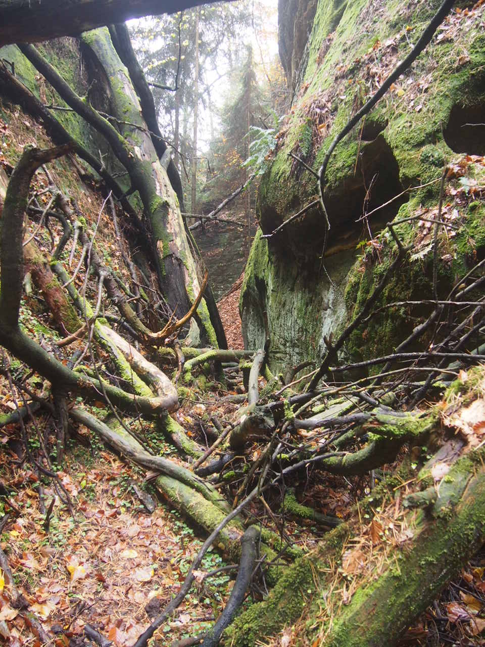 Začátek rokle je hůře přístupný ... úzké průrvy s popadanými stromy ... i v tomto suchém počasí je tady dost vlhko a není problém uklouznout a skončit na zemi.