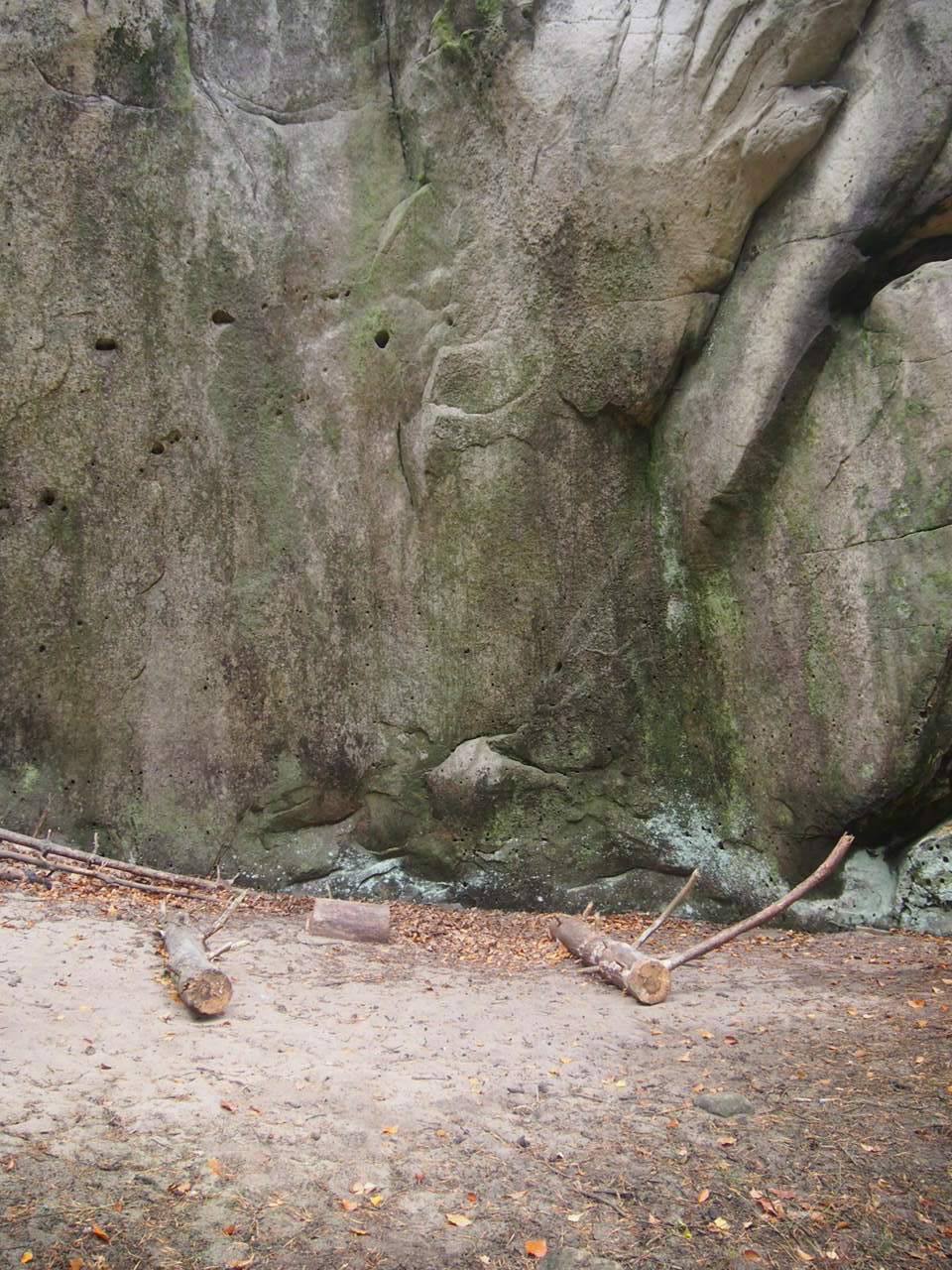 Rokle se rozšiřuje, všude okolo se nad roklí tyčí skály a my zkoumavým pohledem prohlížíme okolí. „Tam nahoře by něco mohlo být," říkám Kačce a už šplhám klouzajícím terénem nahoru ke skalám...a bylo. Našel jsem další pozůstatek trampingu v Českém ráji. Přede mnou se ukazuje trampské tábořiště.
