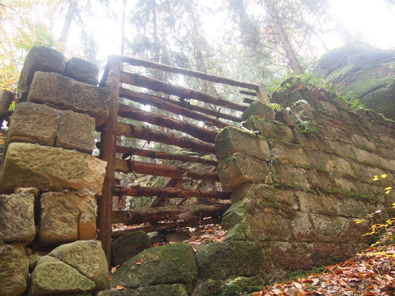 A podle zdi obory stoupáme zase vzhůru. Přes zeď jsou vidět krásné skalní útvary. Díry ve zdi jsou opraveny a zataraseny dřevěnými trámy, aby se tam jen tak někdo nedostal. Dalo by se tam vlézt, ale už toho lezení máme nějak dost a tak pokračujeme nahoru podle zdi k cestě zpátky lesy k Příhrazům.