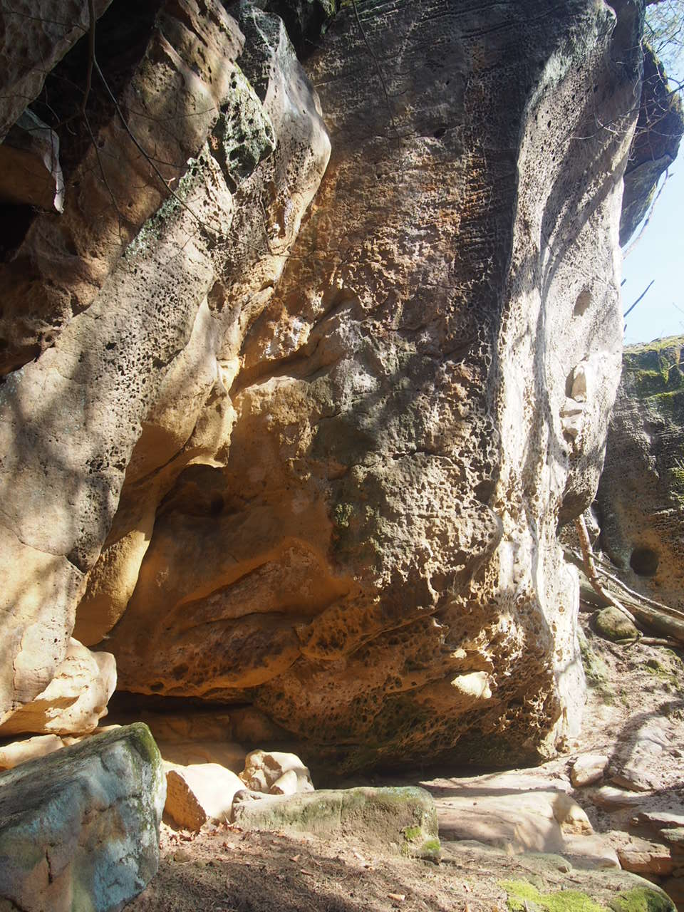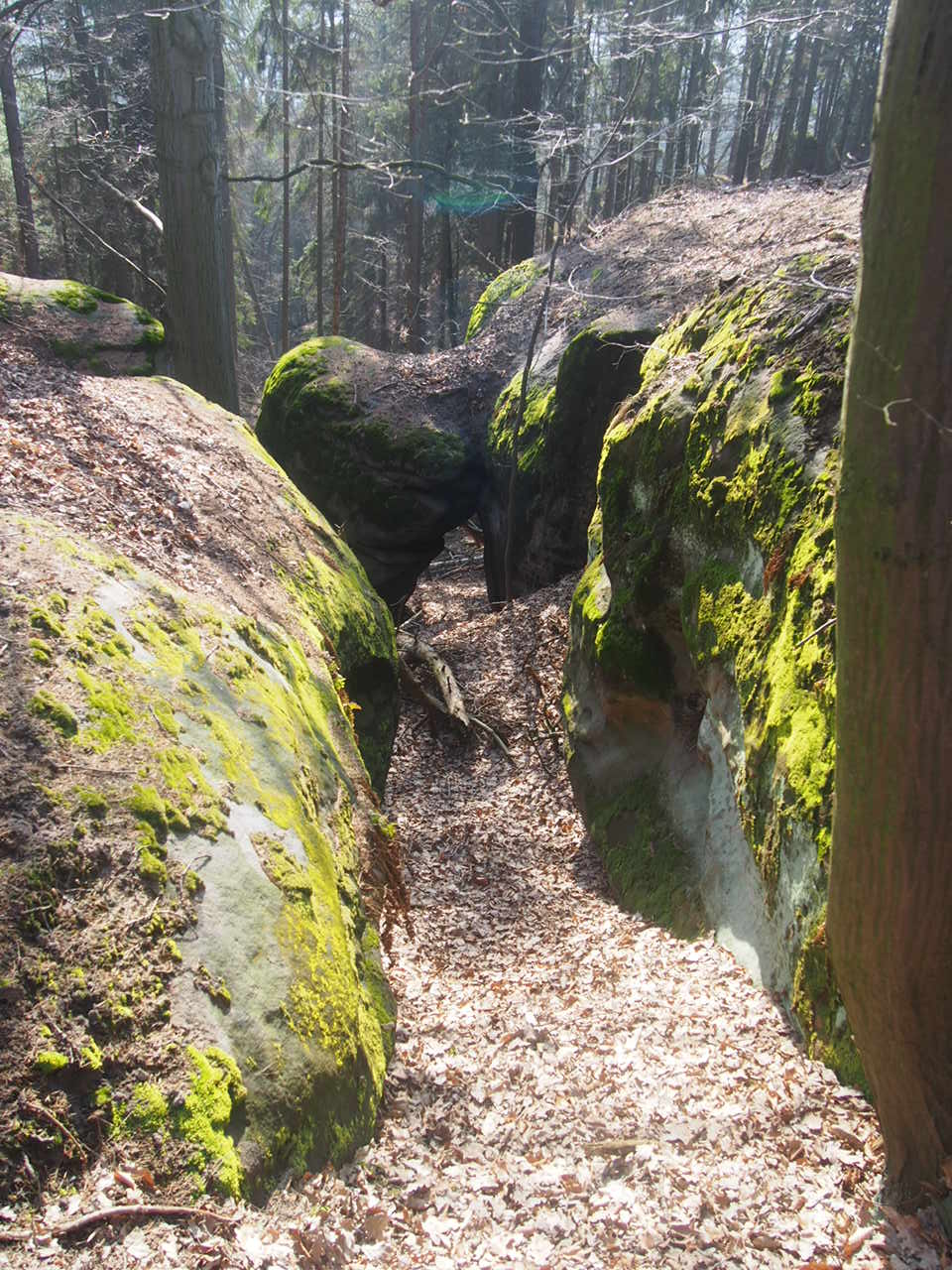 Byli tu docela slušné polomy a hlavně tu byl klid...nikde ani človíčka. Procházeli jsme tichou opuštěnou roklí a rozhlíželi se po okolních skalách. Občas jsme vylezli nahoru ke skalám, abychom je prozkoumali, zda tam není jeskyně Racák.